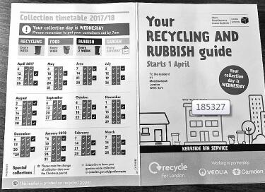 對(duì)于垃圾分類和垃圾回收時(shí)間,區(qū)政府給每個(gè)家庭都印制了專門的小冊(cè)子。由于沒有“讀懂吃透”區(qū)政府的“垃圾回收指南”,記者在倫敦生活的第一周便被工人拒收垃圾。上門回收垃圾的工人,在記者盛放可回收垃圾的綠色垃圾桶上,留下了一張拒收垃圾的說(shuō)明,上面寫道:“由于您的垃圾桶內(nèi)放置了不可回收使用的物品,我們無(wú)法回收,請(qǐng)您遵照以下說(shuō)明,重新清理垃圾桶內(nèi)物品。”